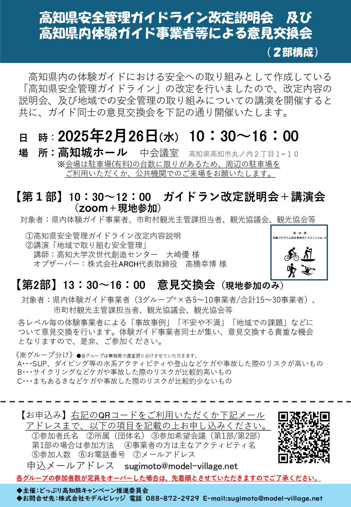 A briefing session on the revised contents and a lecture on safety management initiatives in the region will be held, and participation online is also possible. In the case of local participation, a discussion meeting between guides will also be held in Part 2, so please join us.