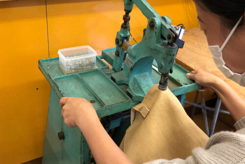 At button press activity, you can experience attaching buttons you choose from several different buttons to a denim roll pen case or tote bag using a special machine.