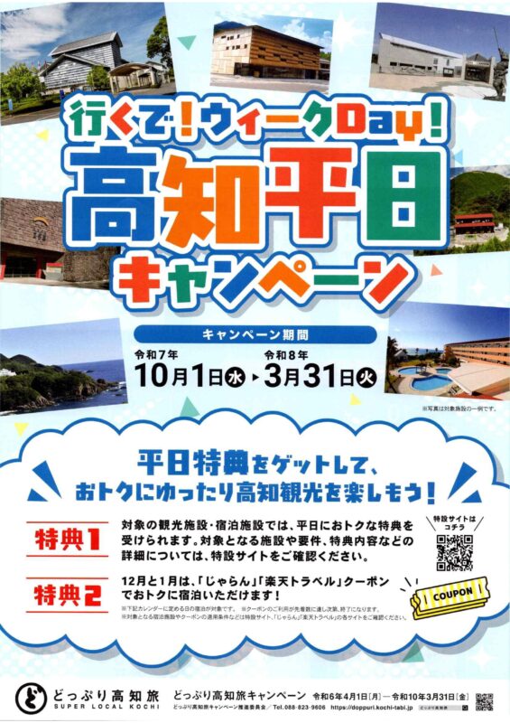 As part of the Kochi Travel Campaign, this is a campaign where you can receive special benefits on weekdays at tourist facilities and accommodations.