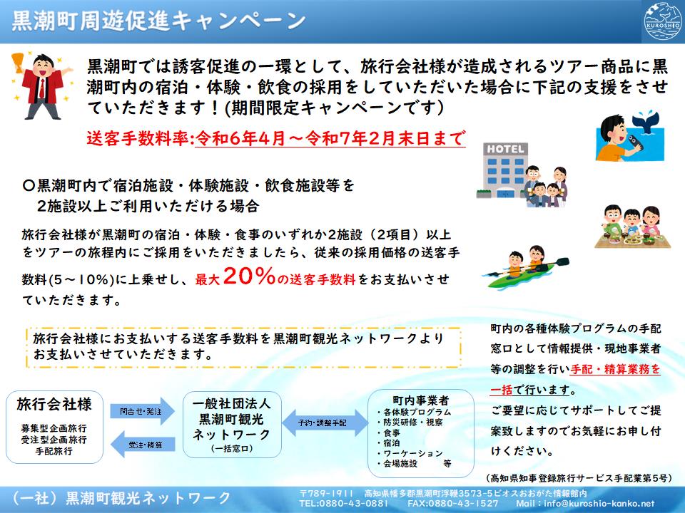 In Kuroshio Town, as part of the promotion of attracting customers, we will support the customer fee if you choose accommodation, activity, and eating and drinking in Kuroshio Town for tour products created by travel agencies! Time-limited