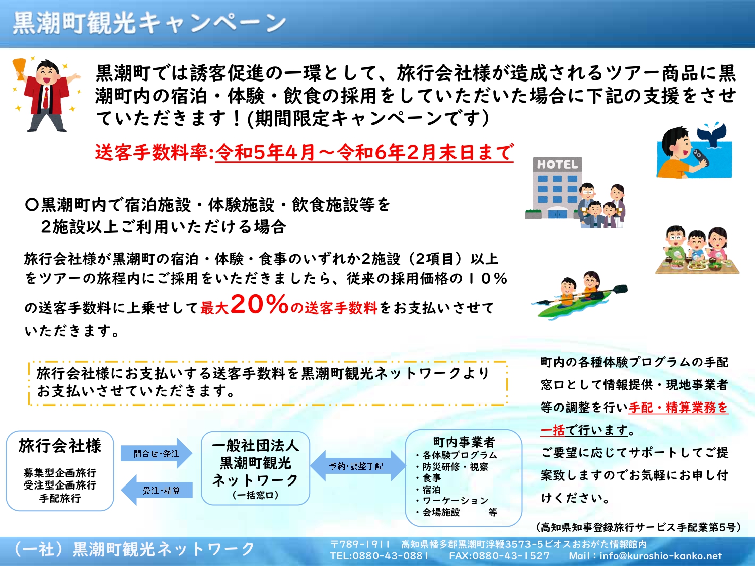 In Kuroshio Town, as part of the promotion of attracting customers, we will support the customer fee if you choose accommodation, activity, and eating and drinking in Kuroshio Town for tour products created by travel agencies! Time-limited